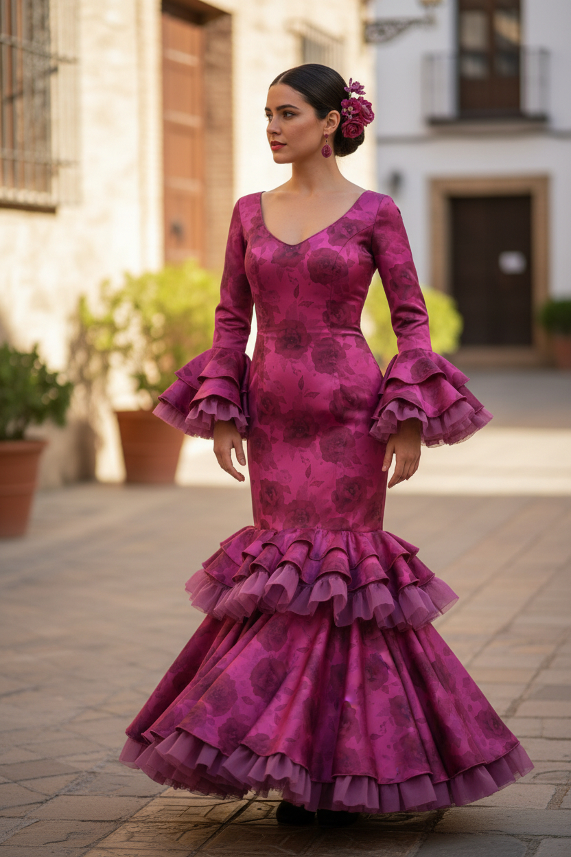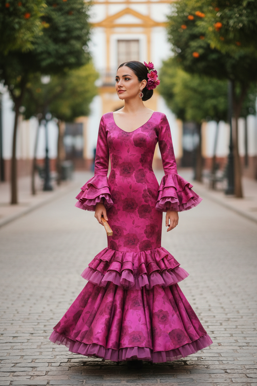 Disponibles en diferentes estilos de trajes de flamenca: clásicos, tradicionales, modernos y de tendencia. Diseños con volantes en falda, mangas o cuerpo que aportan movimiento, presencia escénica y una silueta favorecedora. Vestidos largos de flamenca entallados, pensados para estilizar la figura femenina.