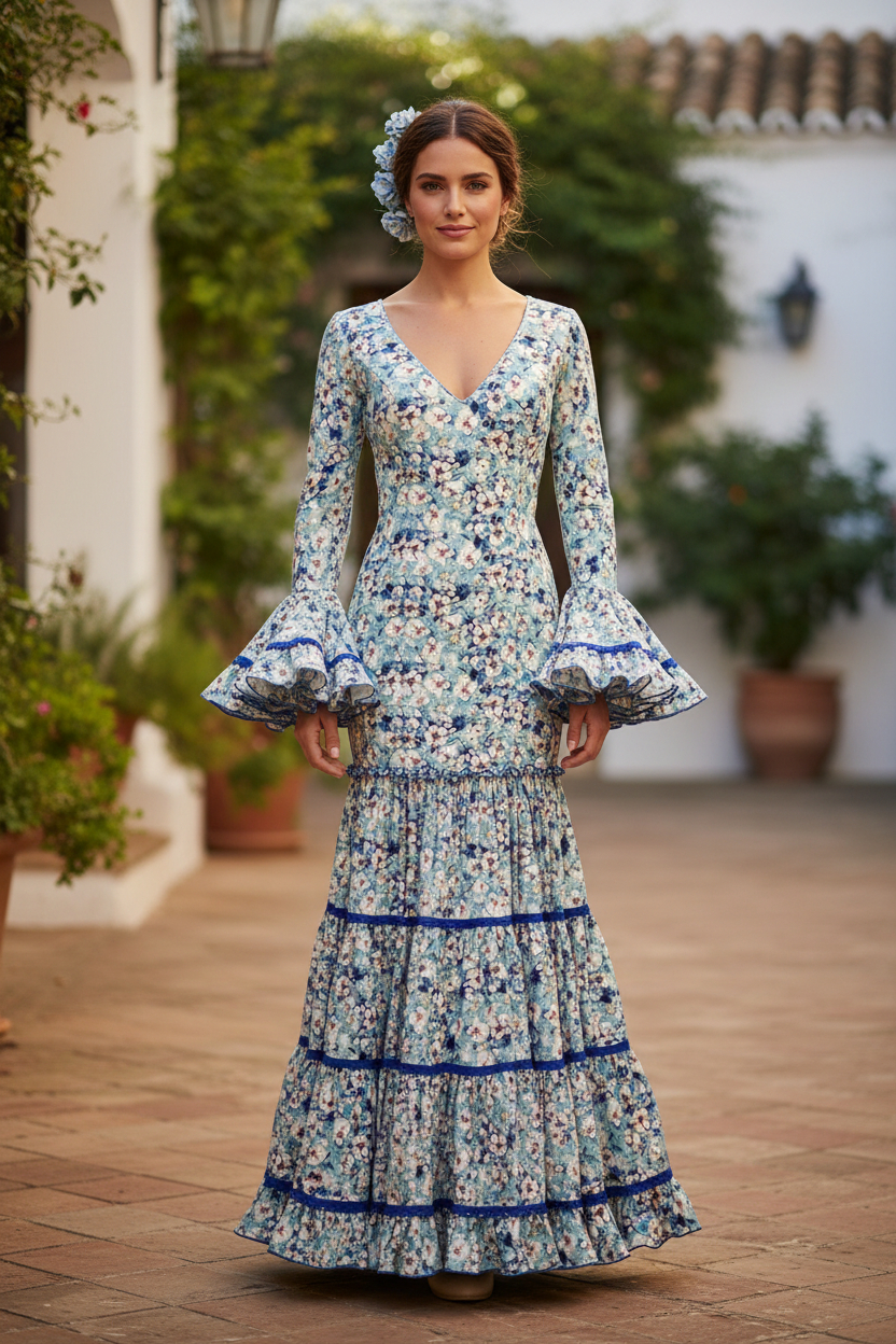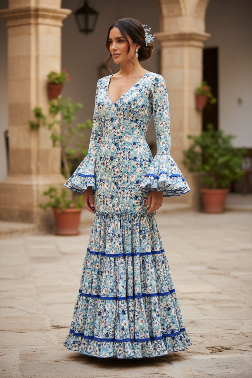 Disponibles en diferentes estilos de trajes de flamenca: clásicos, tradicionales, modernos y de tendencia. Diseños con volantes en falda, mangas o cuerpo que aportan movimiento, presencia escénica y una silueta favorecedora. Vestidos largos de flamenca entallados, pensados para estilizar la figura femenina.