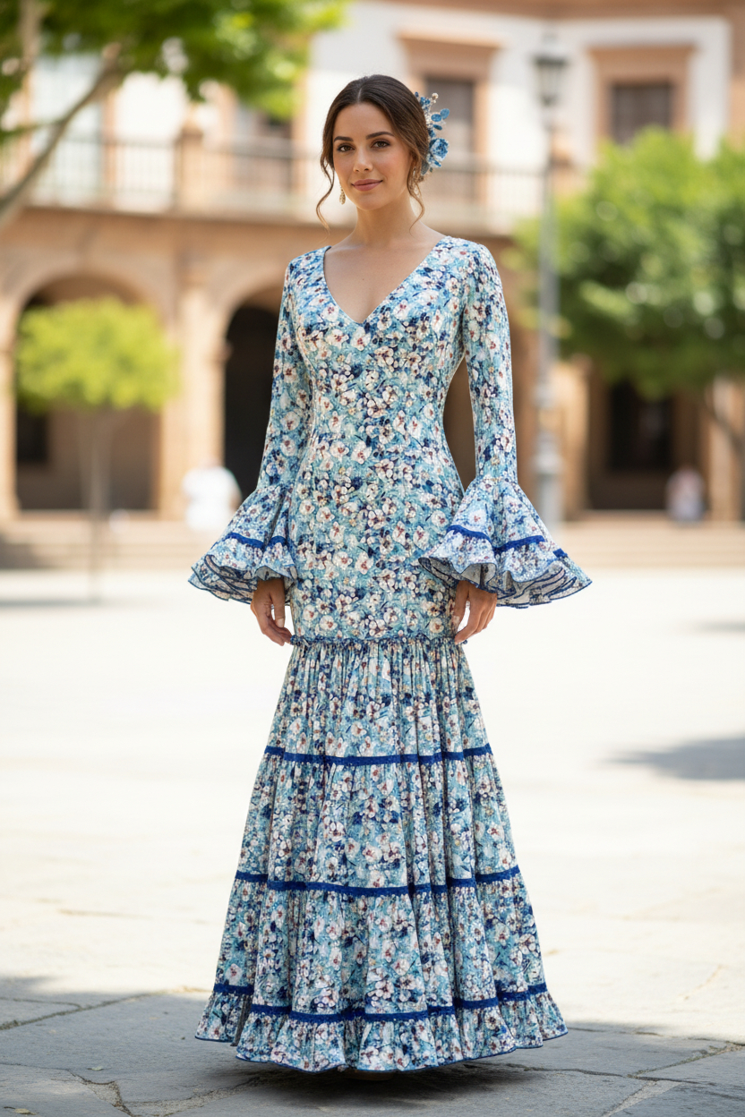 Este vestido de flamenca está realizado con tejidos de alta calidad, seleccionados para garantizar una excelente caída, resistencia y un vuelo impecable de los volantes. Su diseño permite libertad de movimiento, siendo ideal tanto para bailar flamenco como para disfrutar durante largas jornadas de feria, romerías y celebraciones populares.