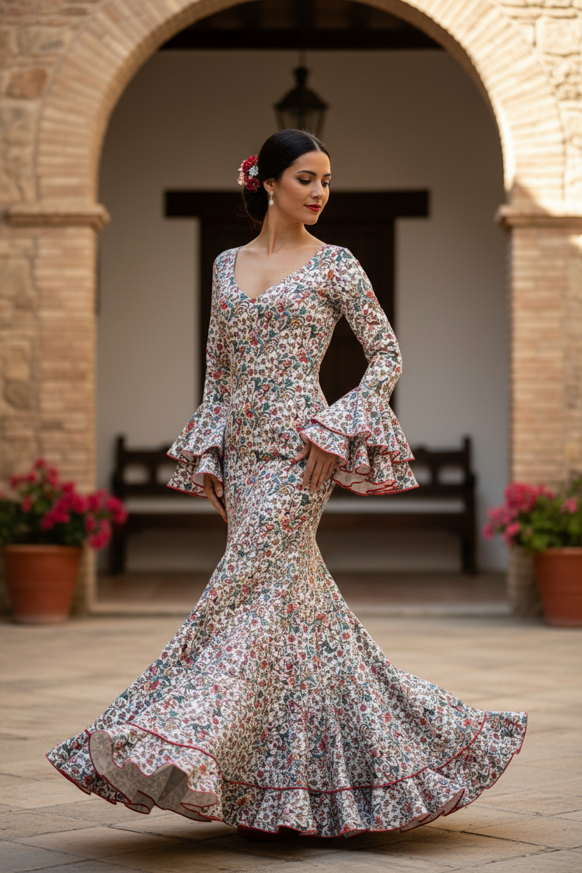 Trajes de flamenca fabricados íntegramente en España, siguiendo procesos artesanales y respetando la tradición de la costura flamenca sevillana. Los tejidos utilizados ofrecen cuerpo, caída y resistencia, lo que convierte estos vestidos de flamenca en una opción ideal para largas jornadas de feria, romerías y actuaciones.