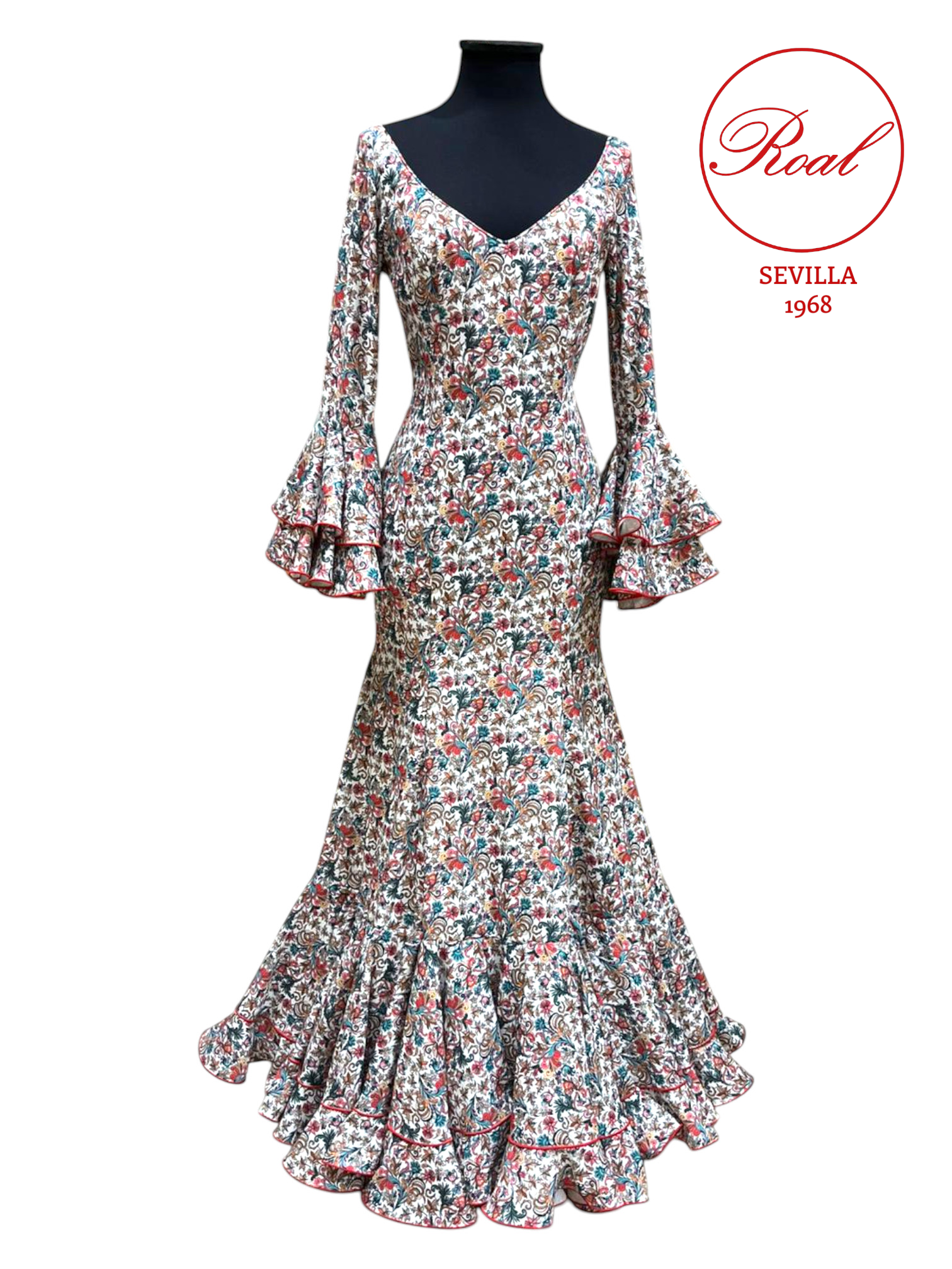 Traje de flamenca Roal confeccionado en Sevilla por Casa Creaciones Roal, una firma histórica de la moda flamenca que lleva desde 1968 dedicada a la confección de trajes de flamenca y trajes de gitana. Más de cinco décadas de experiencia avalan a esta casa, reconocida por sus patrones únicos, diseños exclusivos y el uso de telas de primera calidad.