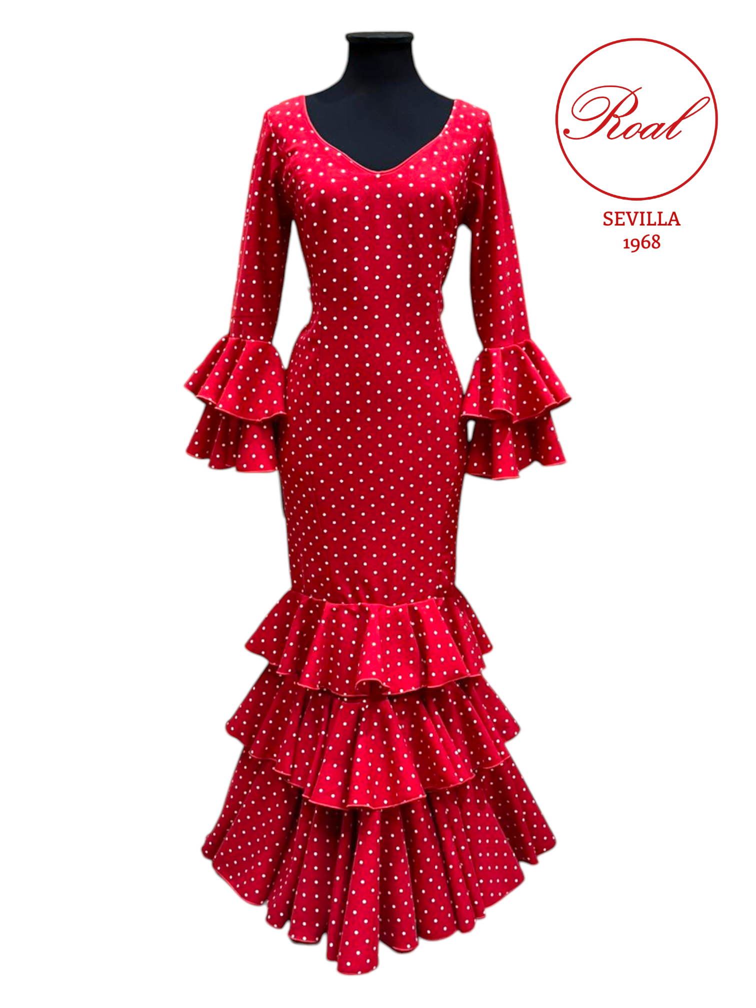 Traje de flamenca Roal confeccionado en Sevilla por Casa Creaciones Roal, una firma histórica de la moda flamenca que lleva desde 1968 dedicada a la confección de trajes de flamenca y trajes de gitana. Más de cinco décadas de experiencia avalan a esta casa, reconocida por sus patrones únicos, diseños exclusivos y el uso de telas de primera calidad.