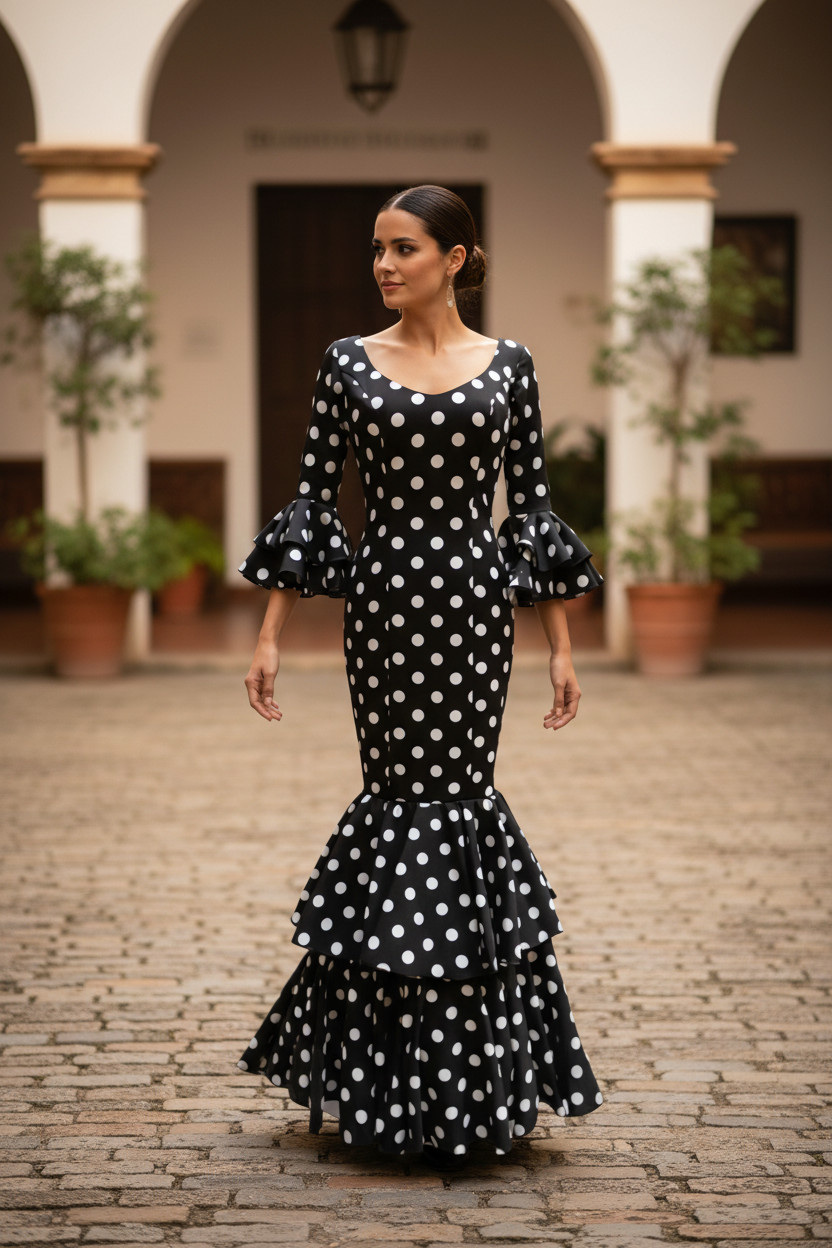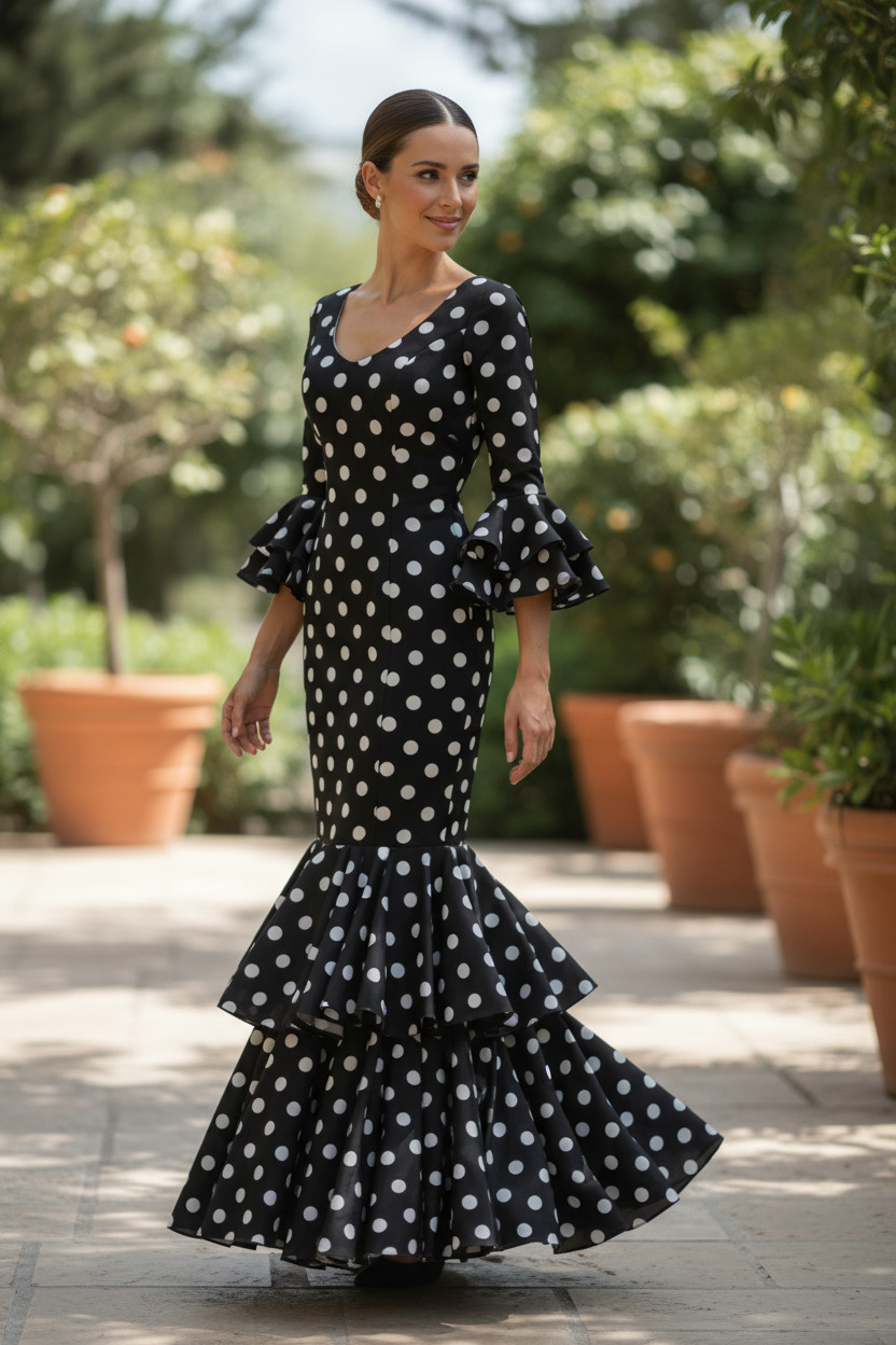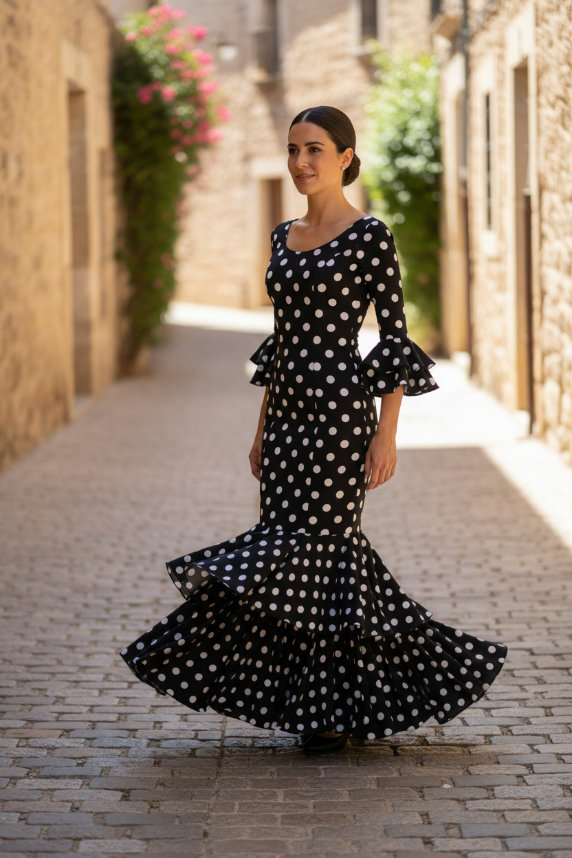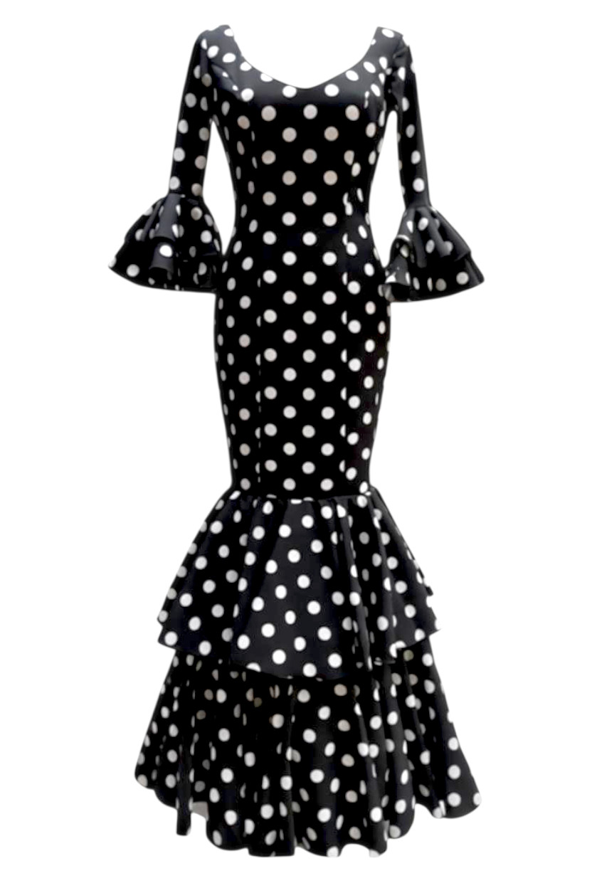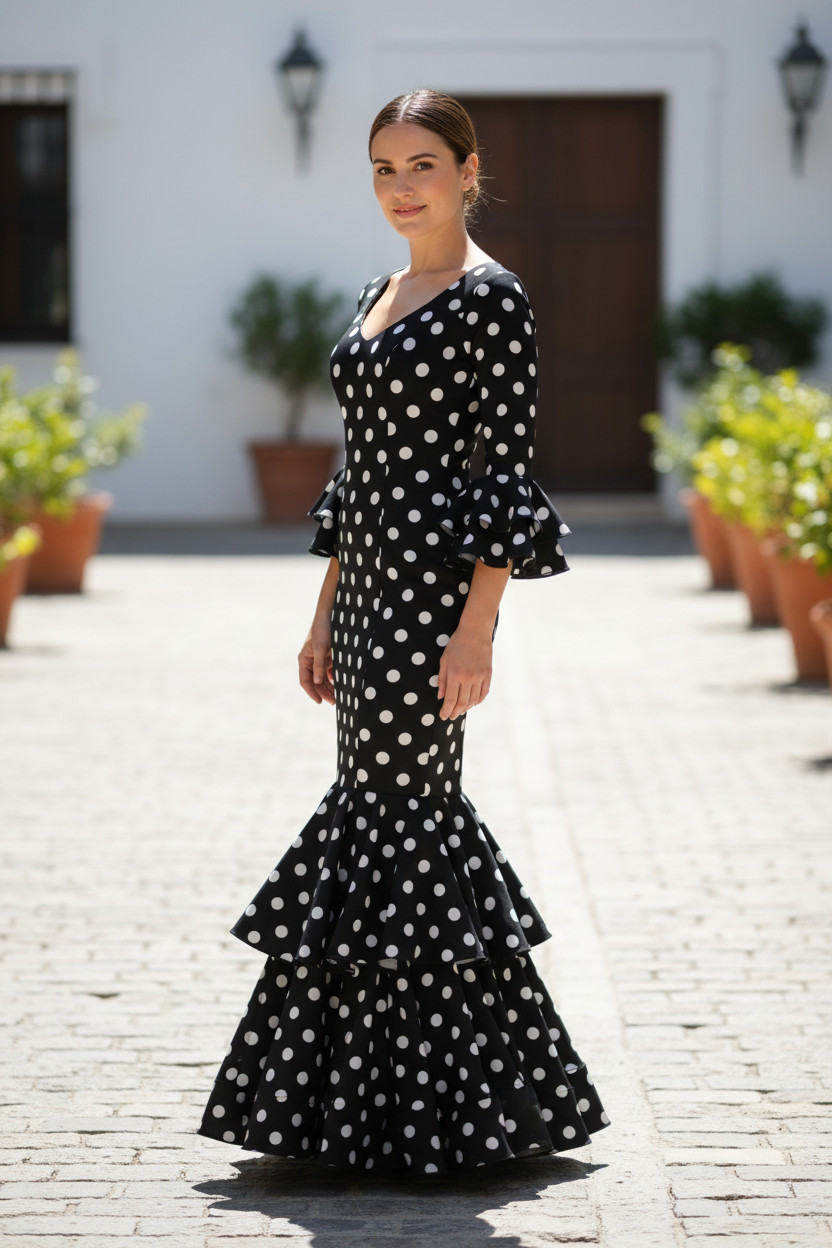 Talla 40. Vestido de Flamenca. Mod. Lola Negro Lunar Blanco