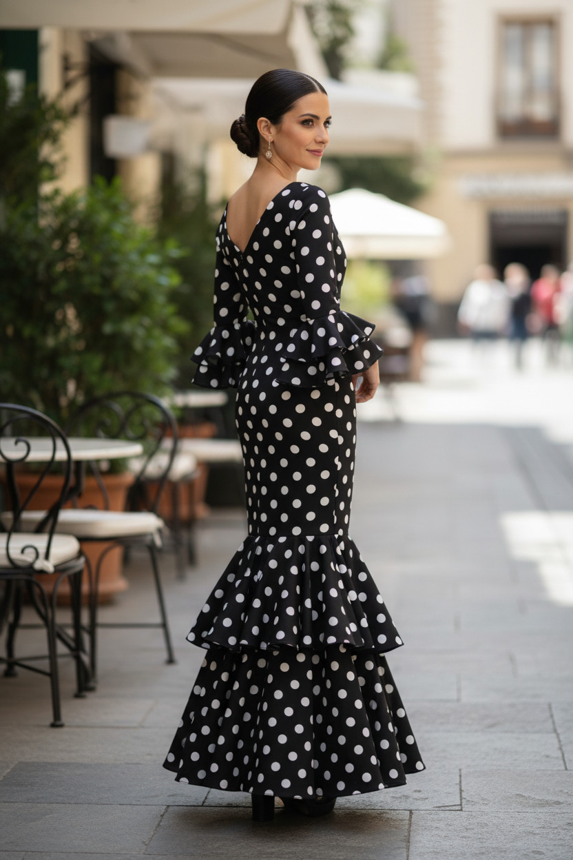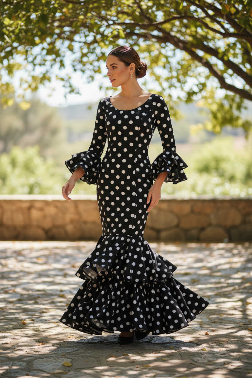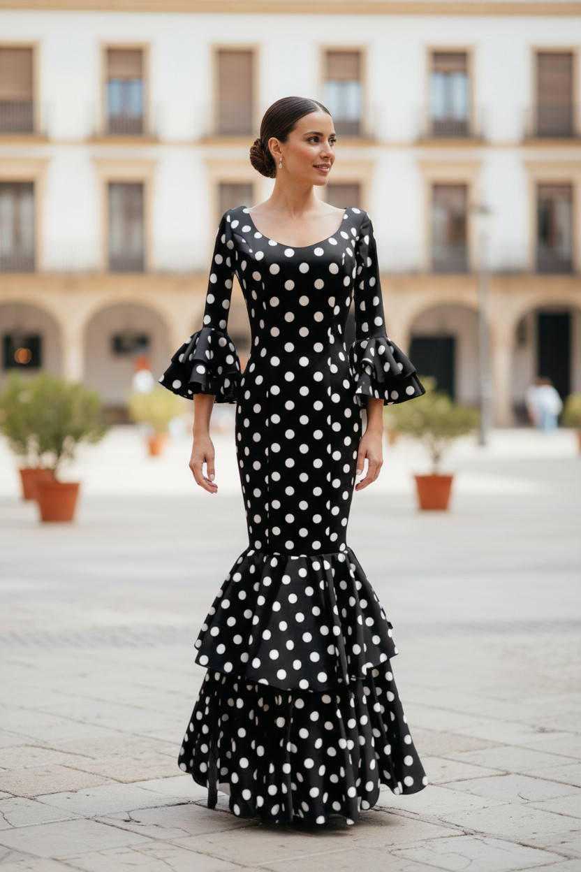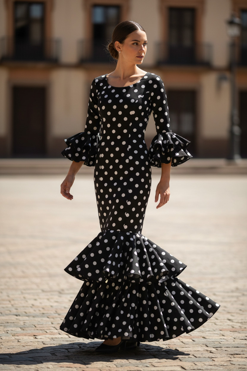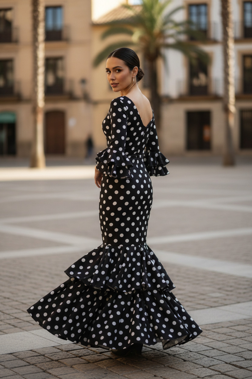 Talla 40. Vestido de Flamenca. Mod. Lola Negro Lunar Blanco