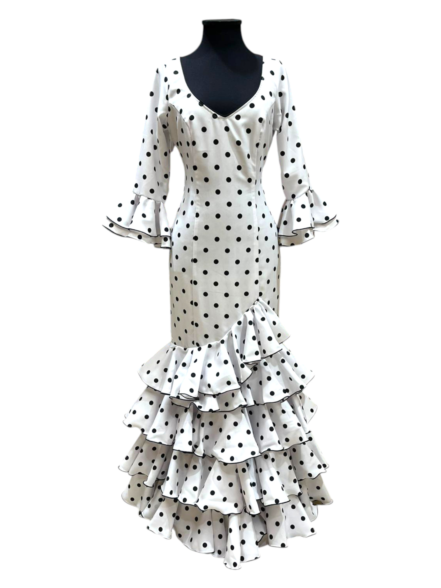 Talla 42. Vestido de Flamenca Modelo Lolita. Blanco lunares negros medianos