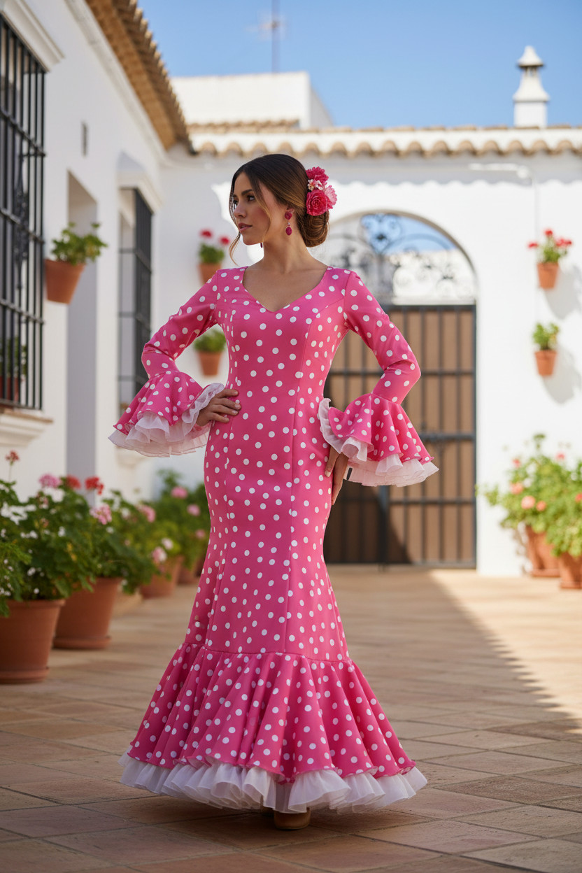 Este vestido de flamenca está realizado con tejidos de alta calidad, seleccionados para garantizar una excelente caída, resistencia y un vuelo impecable de los volantes. Su diseño permite libertad de movimiento, siendo ideal tanto para bailar flamenco como para disfrutar durante largas jornadas de feria, romerías y celebraciones populares.