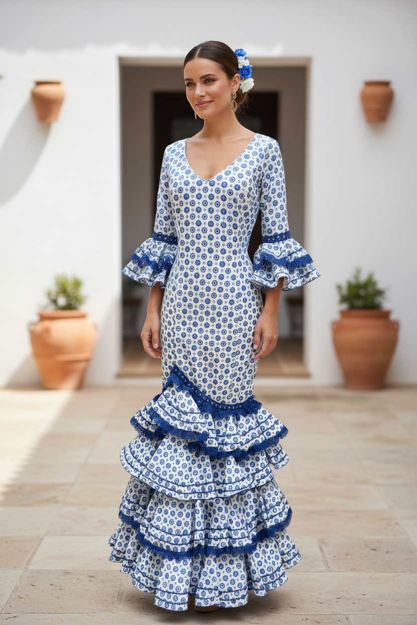 Traje de flamenca Roal confeccionado en Sevilla por Casa Creaciones Roal, una firma histórica de la moda flamenca que lleva desde 1968 dedicada a la confección de trajes de flamenca y trajes de gitana. Más de cinco décadas de experiencia avalan a esta casa, reconocida por sus patrones únicos, diseños exclusivos y el uso de telas de primera calidad.
