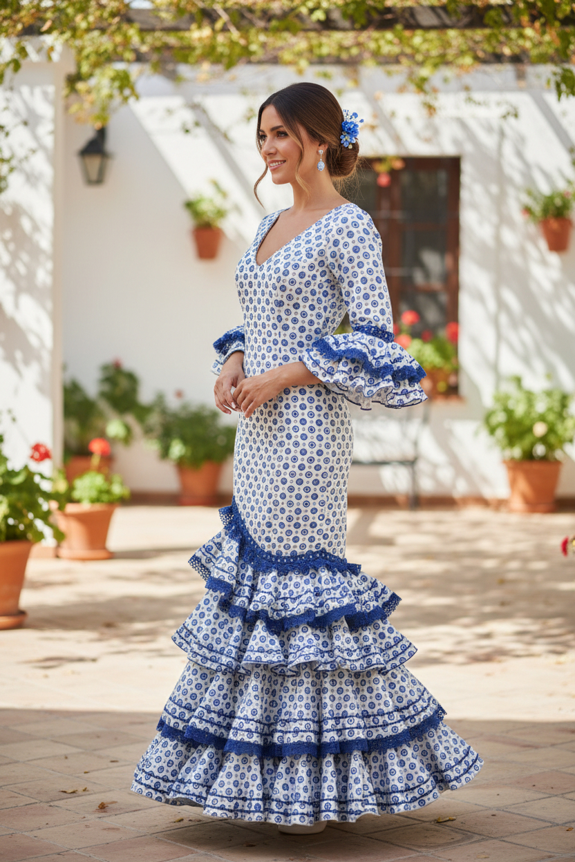 Trajes de flamenca fabricados íntegramente en España, siguiendo procesos artesanales y respetando la tradición de la costura flamenca sevillana. Los tejidos utilizados ofrecen cuerpo, caída y resistencia, lo que convierte estos vestidos de flamenca en una opción ideal para largas jornadas de feria, romerías y actuaciones.