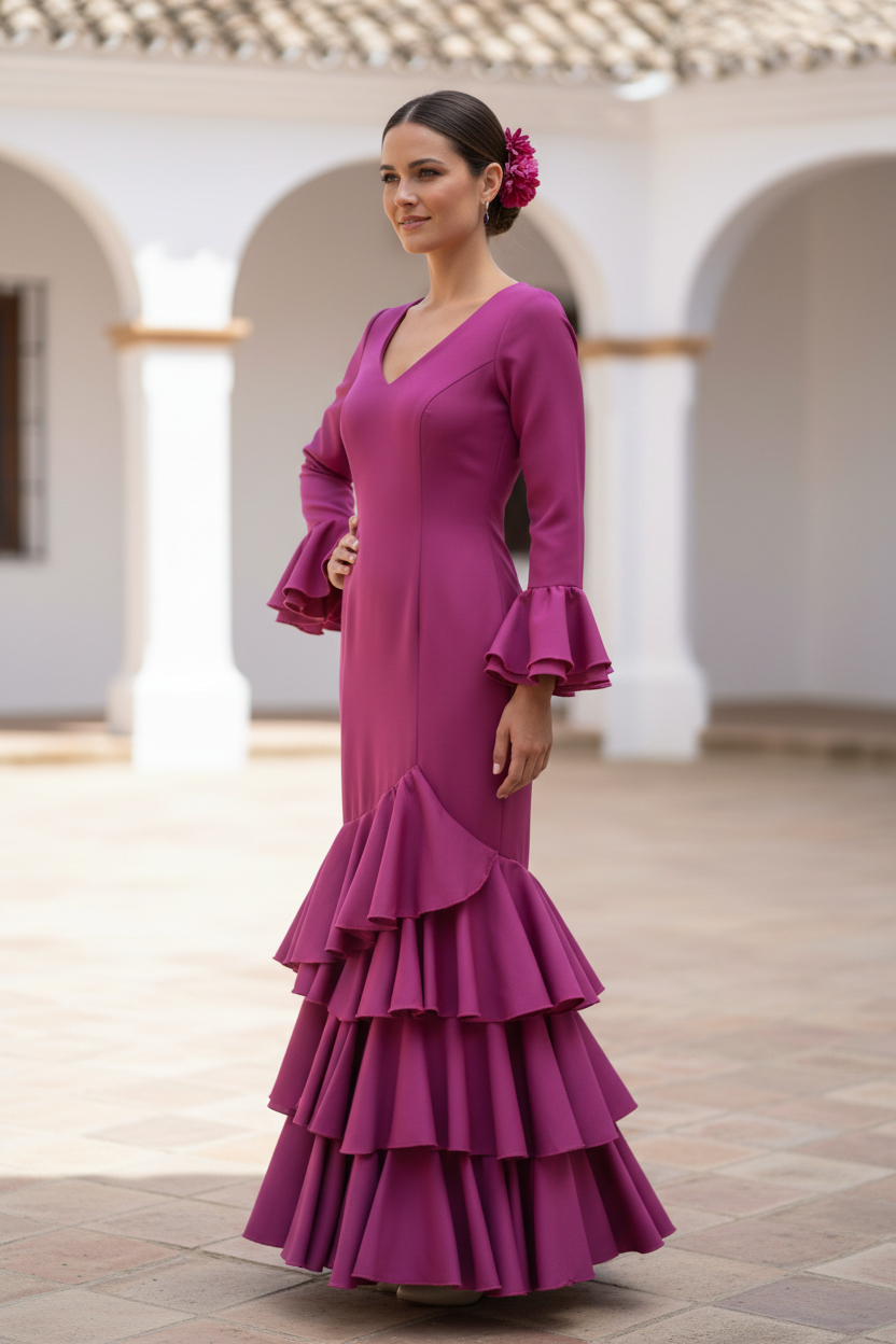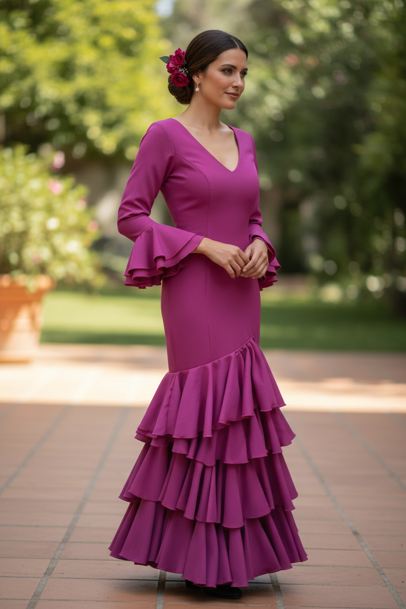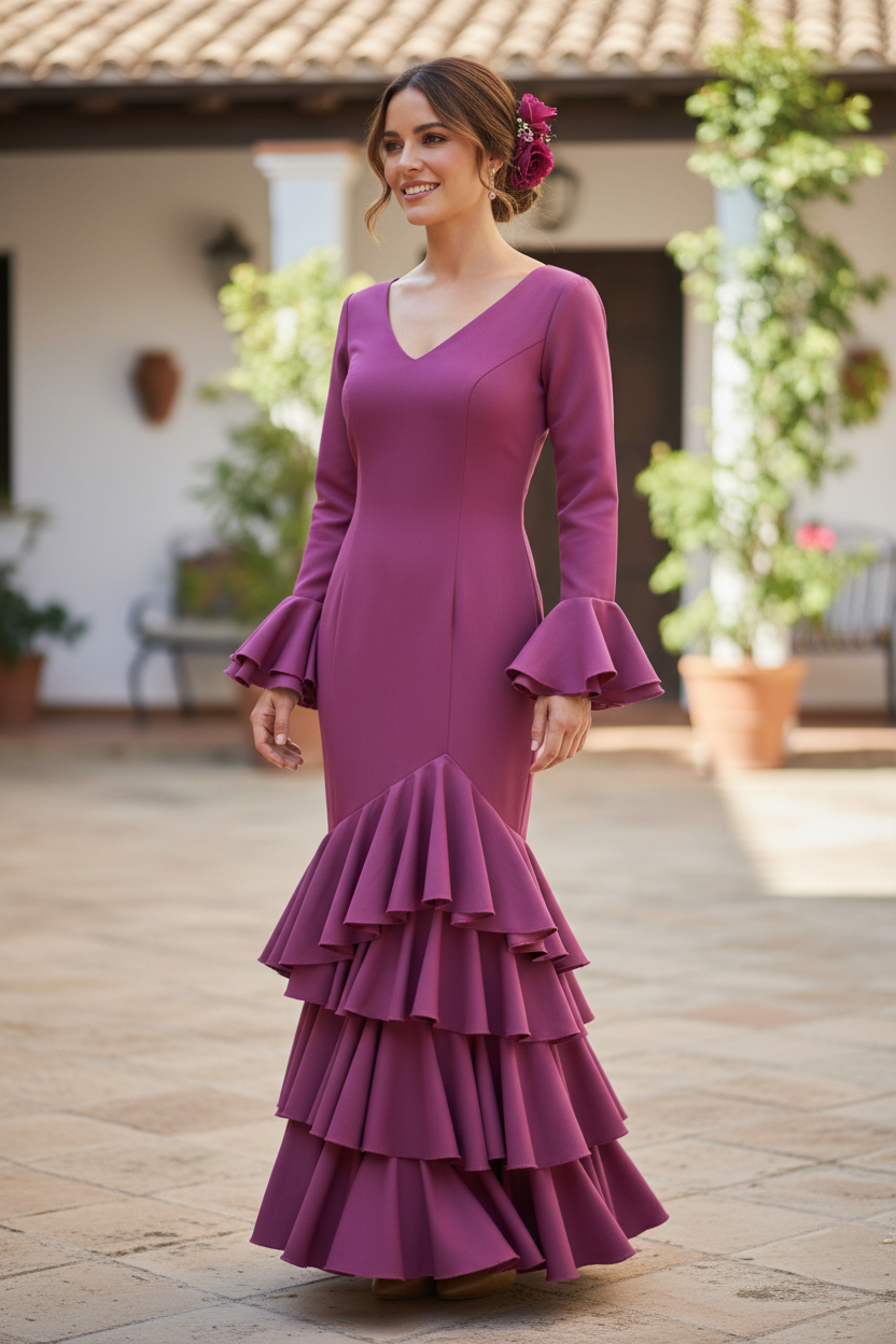 Este vestido de flamenca de cinco volantes con subida está diseñado para realzar la figura, marcar la cintura y estilizar la silueta, convirtiéndose en una opción perfecta para todo tipo de cuerpos. La subida de volantes es uno de los cortes más favorecedores en los trajes de gitana, ya que alarga visualmente las piernas y aporta movimiento al caminar y al bailar. Su manga tres cuartos con dos volantes añade un toque clásico y flamenco, manteniendo un equilibrio perfecto entre tradición y frescura.