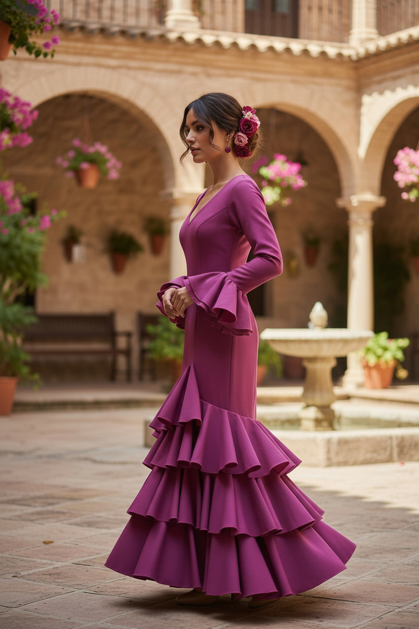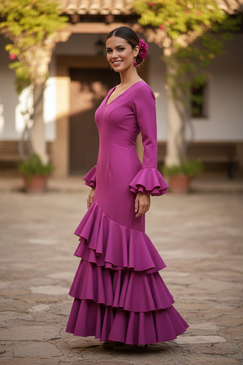 Este vestido de flamenca con volantes destaca por su ligereza, su movimiento natural y su diseño pensado para disfrutar de la feria durante horas. Un traje perfecto para pasear por el Real, bailar sevillanas, disfrutar del ambiente flamenco y vivir la feria con arte y comodidad.