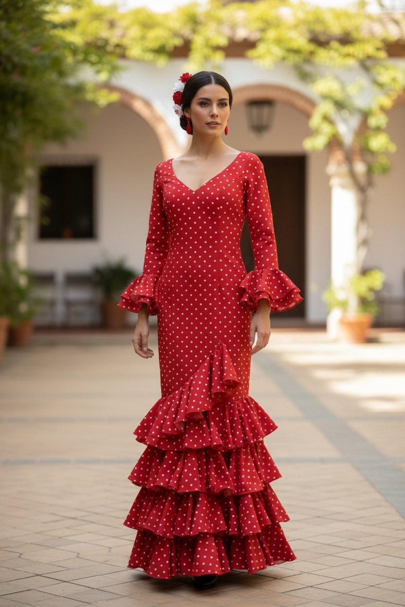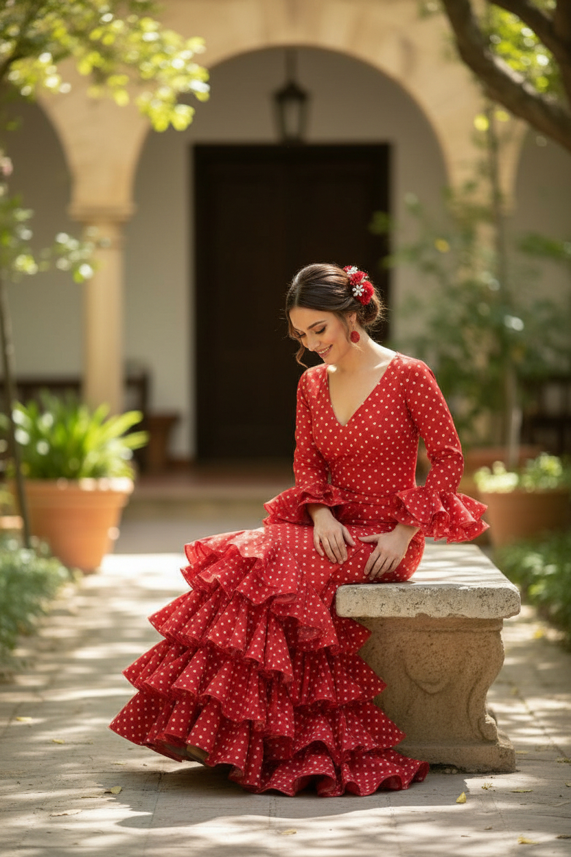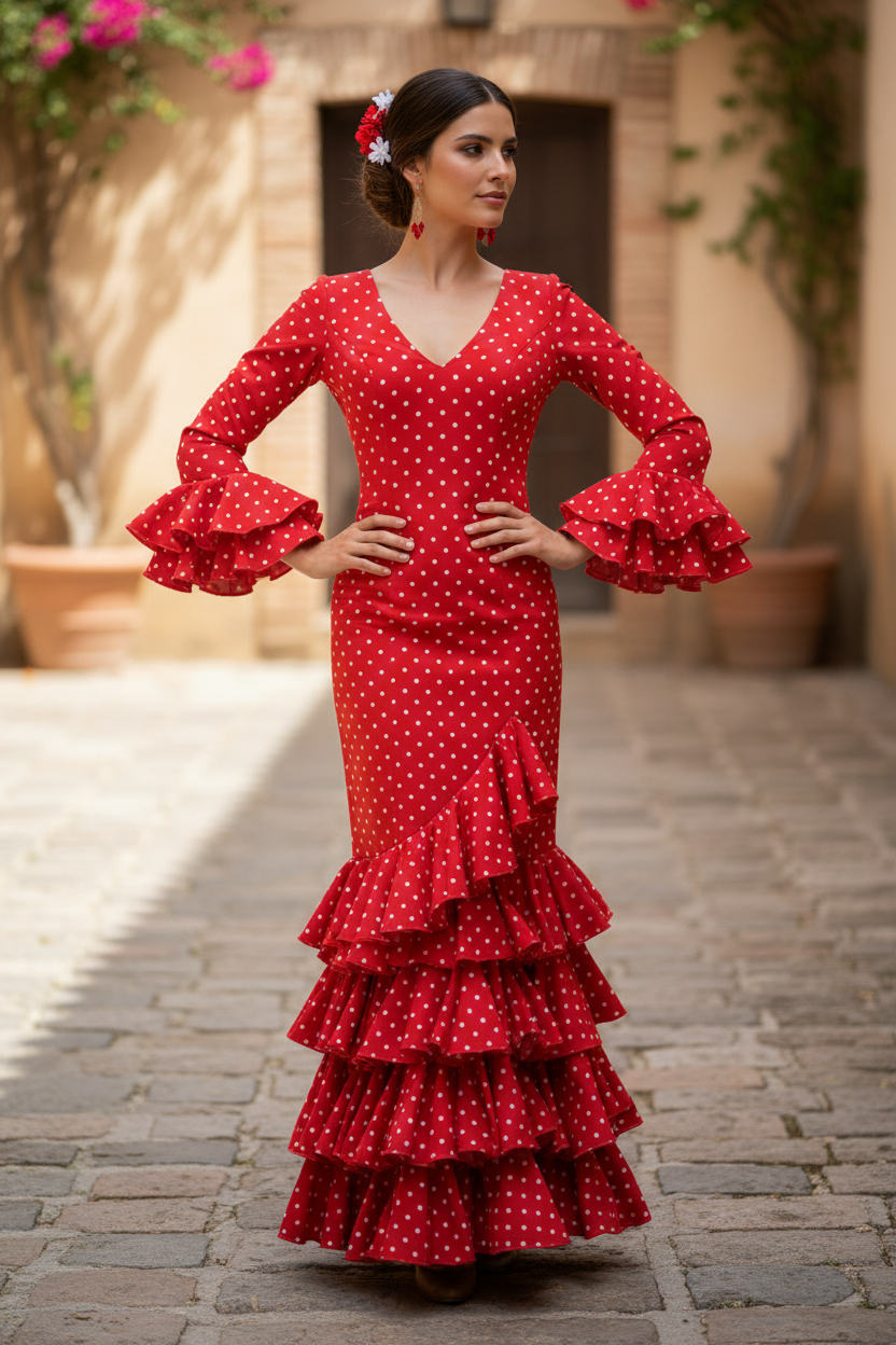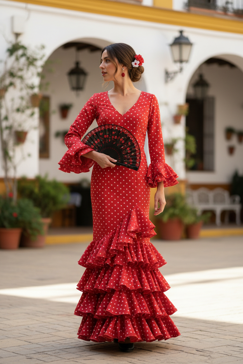 Este vestido de flamenca con volantes destaca por su ligereza, su movimiento natural y su diseño pensado para disfrutar de la feria durante horas. Un traje perfecto para pasear por el Real, bailar sevillanas, disfrutar del ambiente flamenco y vivir la feria con arte y comodidad.