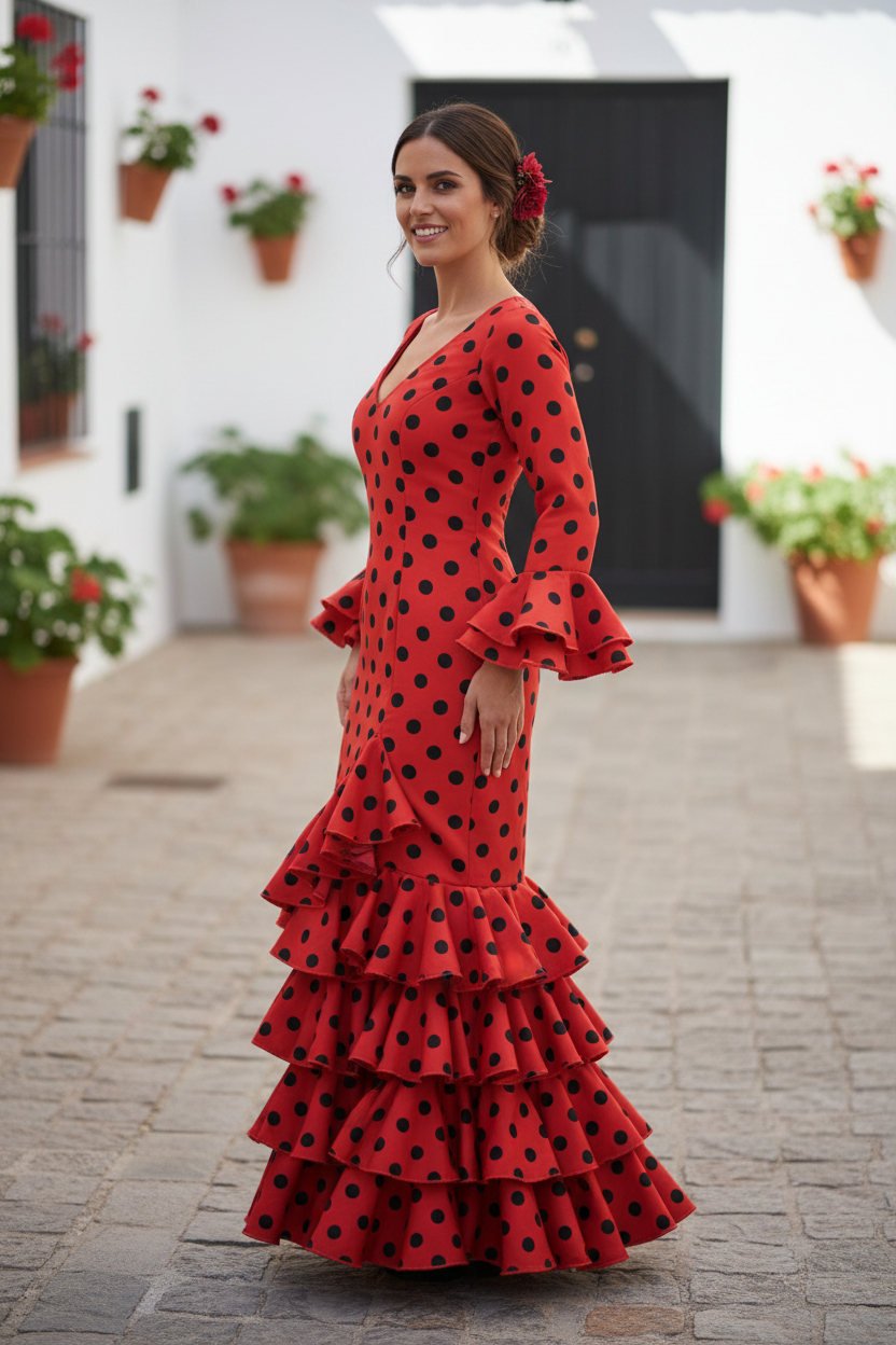 Este vestido de flamenca con volantes destaca por su ligereza, su movimiento natural y su diseño pensado para disfrutar de la feria durante horas. Un traje perfecto para pasear por el Real, bailar sevillanas, disfrutar del ambiente flamenco y vivir la feria con arte y comodidad.
