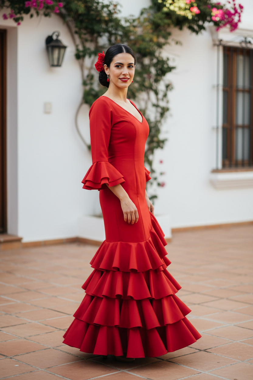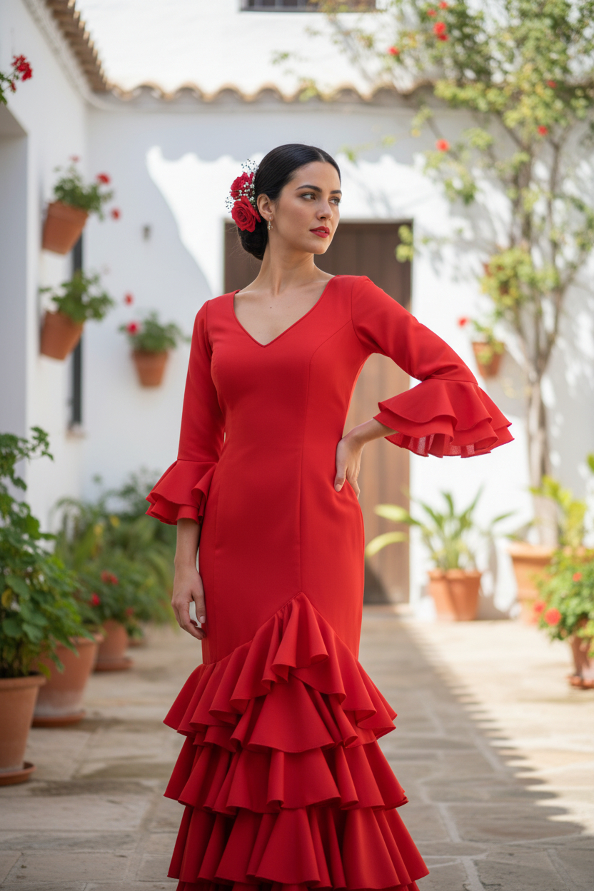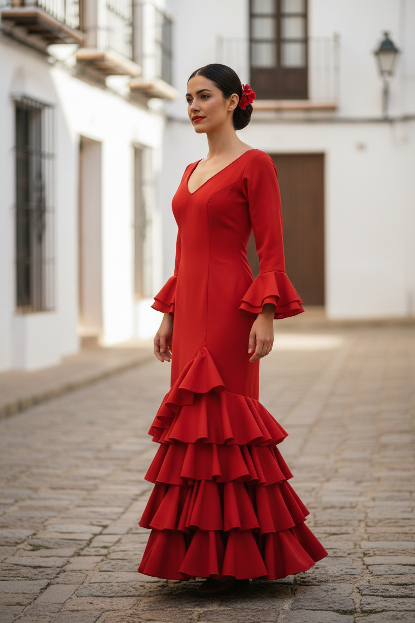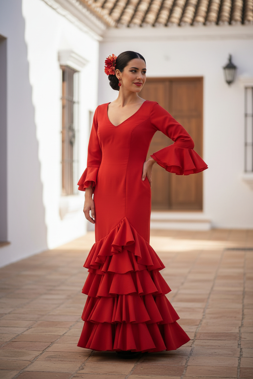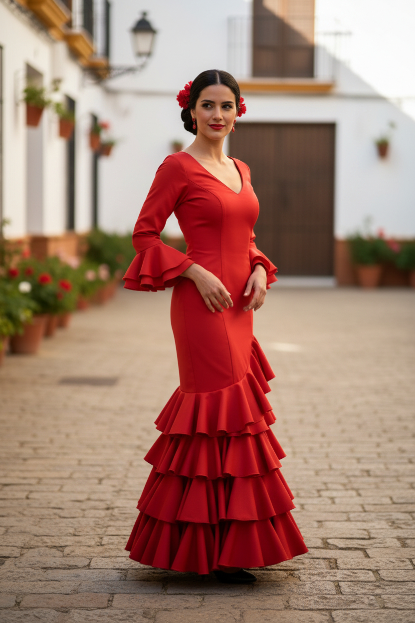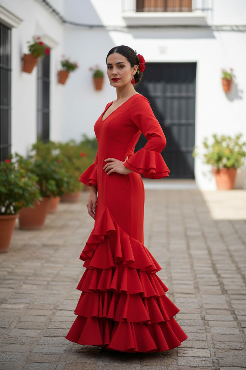 Este vestido de flamenca con volantes destaca por su ligereza, su movimiento natural y su diseño pensado para disfrutar de la feria durante horas. Un traje perfecto para pasear por el Real, bailar sevillanas, disfrutar del ambiente flamenco y vivir la feria con arte y comodidad.