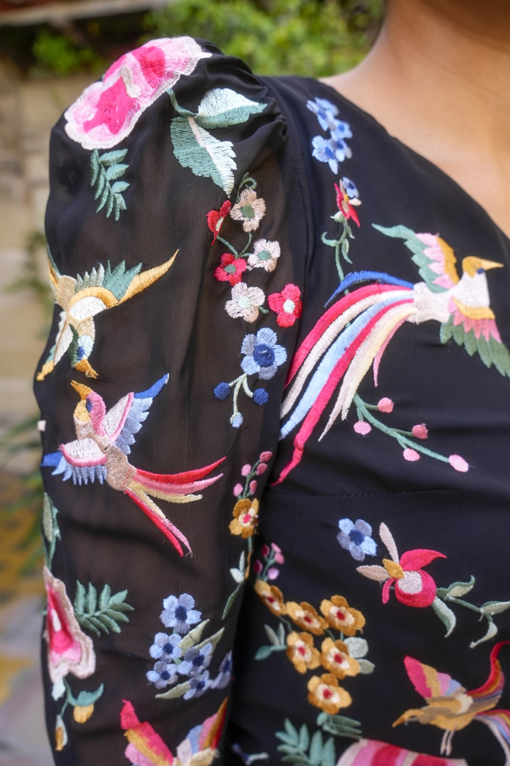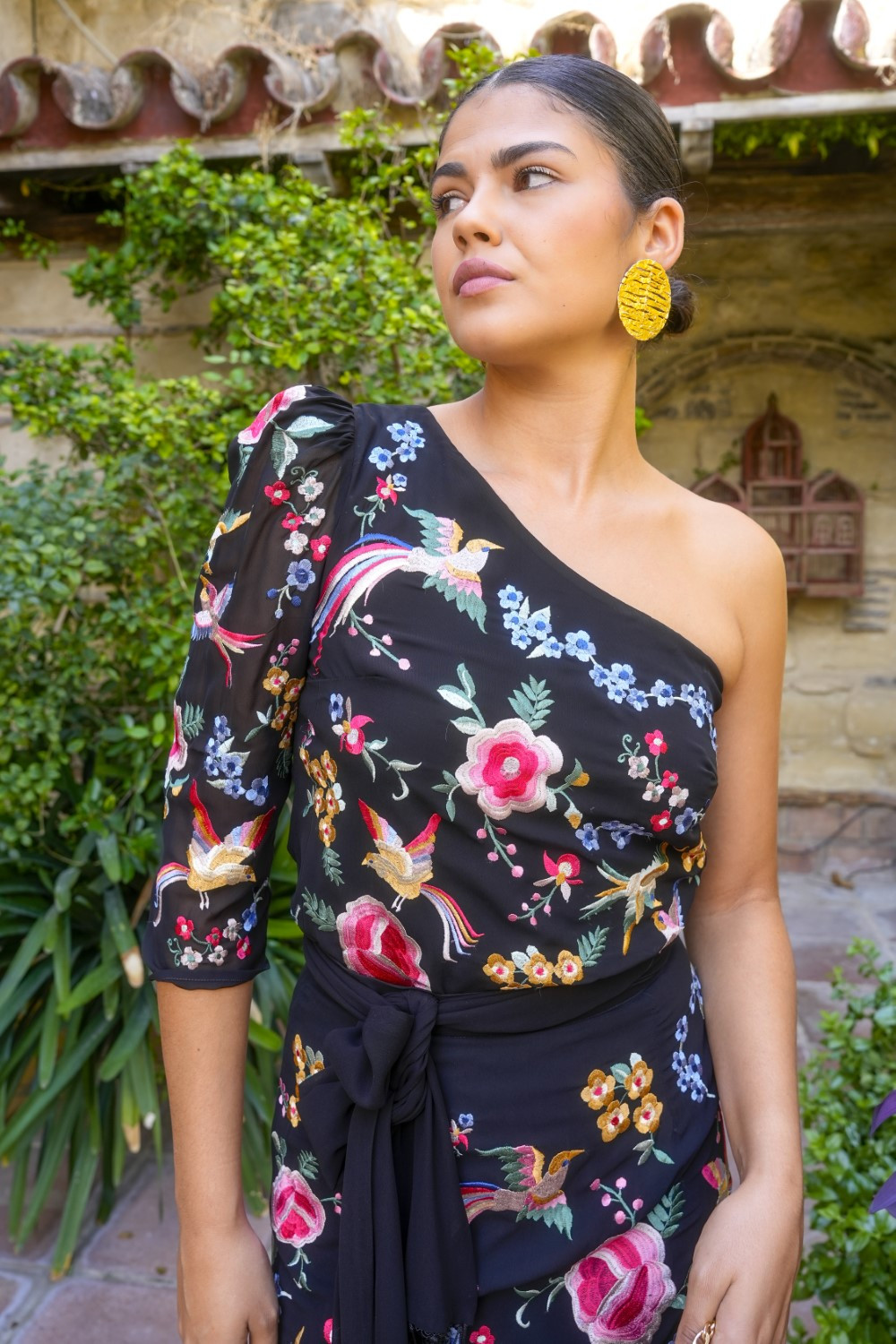 Su corte asimétrico de un solo hombro aporta un toque de sensualidad y originalidad, mientras que los bordados florales y de aves en colores vivos evocan el arte del mantón de Manila tradicional.