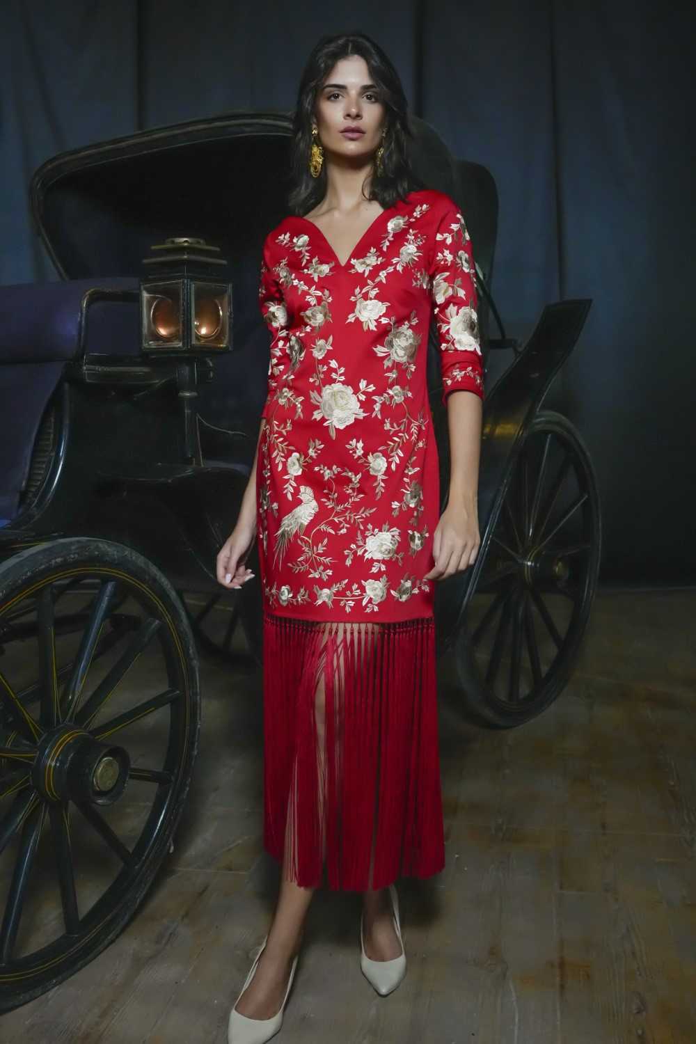 Vestido Chanelando rojo bordado con escote corazón y flecos