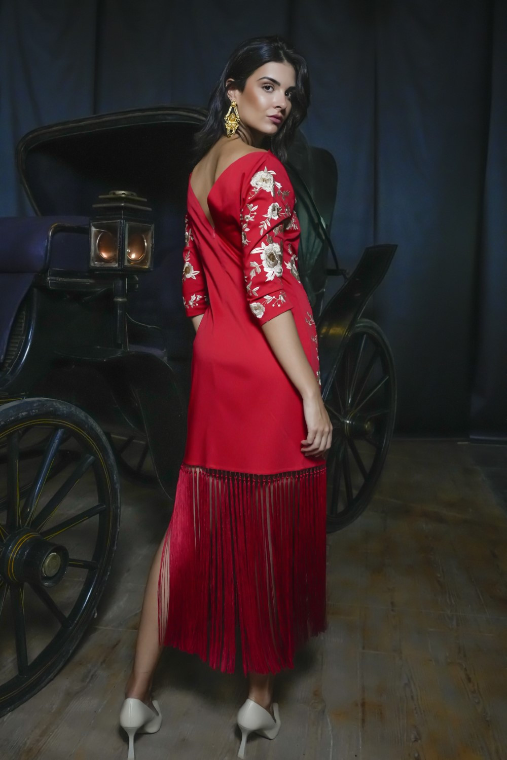 El bajo, rematado con flecos largos al tono, genera un movimiento espectacular que acompaña cada paso con gracia y estilo.