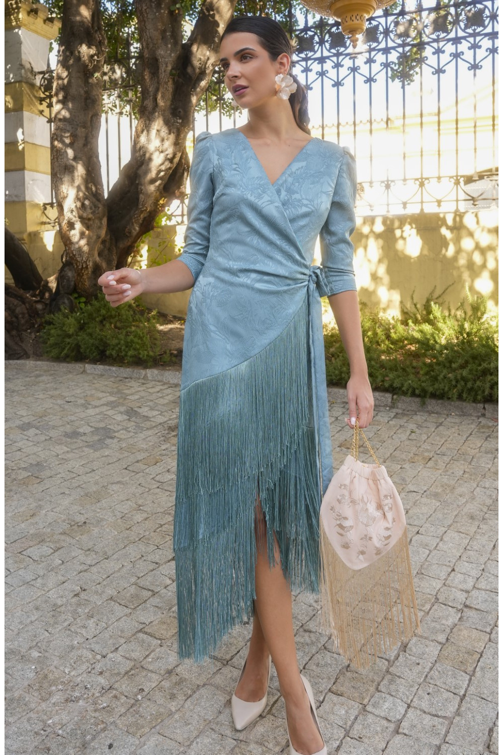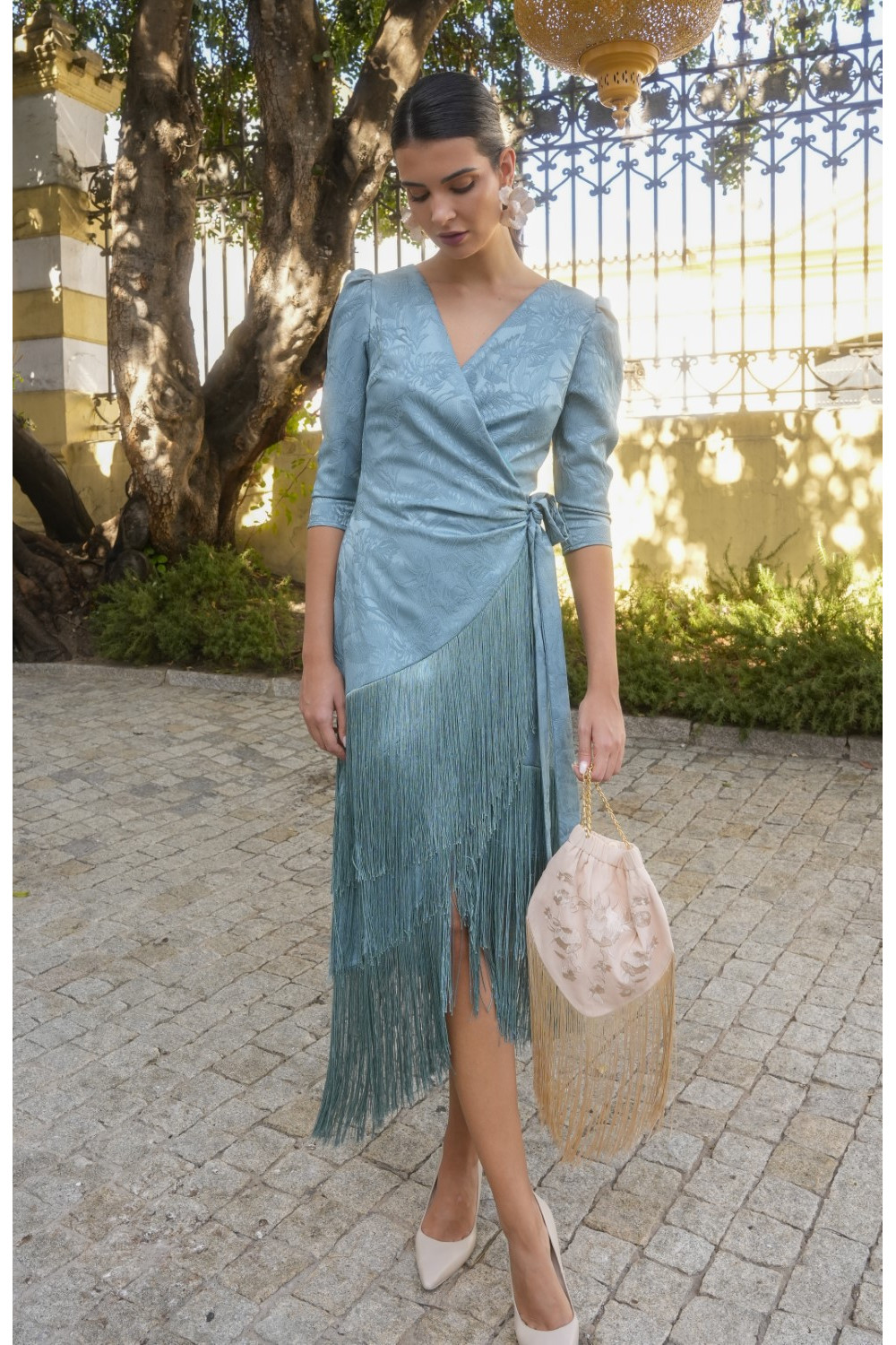 Vestido Luz azul verdoso con flecos y nudo lateral
