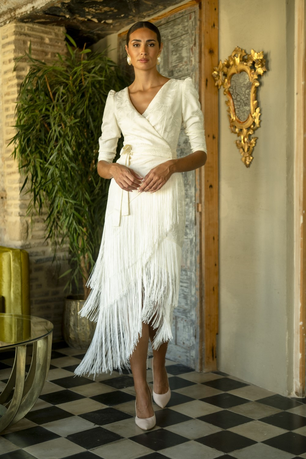 El Vestido Luz blanco es sinónimo de elegancia y sofisticación. Su diseño, inspirado en la moda flamenca contemporánea, destaca por su patrón cruzado con escote en pico y un favorecedor nudo lateral que estiliza la silueta con naturalidad.