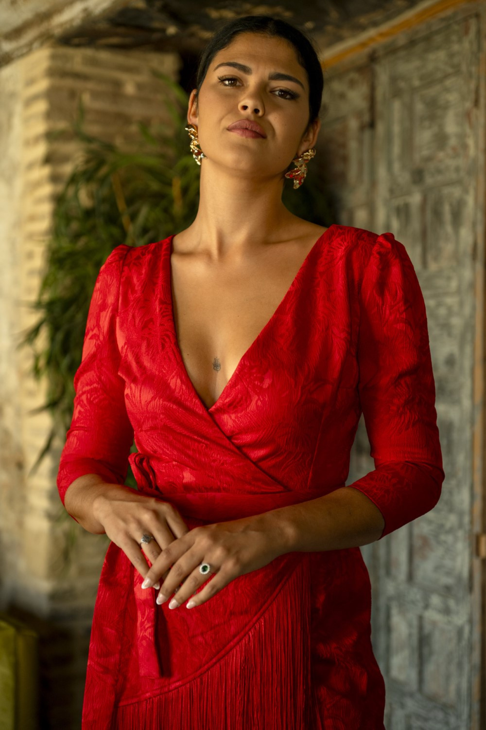 Ideal para ferias, actuaciones, invitadas o eventos de gala, el Vestido Luz rojo es una prenda 100% confeccionada en España que une el arte tradicional con la moda actual.