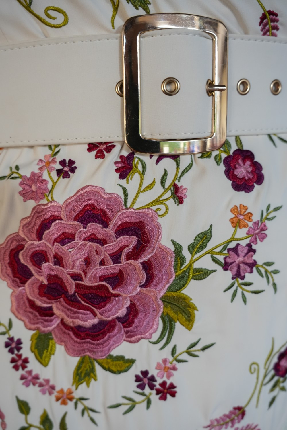 Confeccionado en un tejido beige de gran caída y suavidad, luce bordados florales artesanales en tonos rosas, burdeos y verdes, que evocan la esencia de los mantones bordados andaluces.