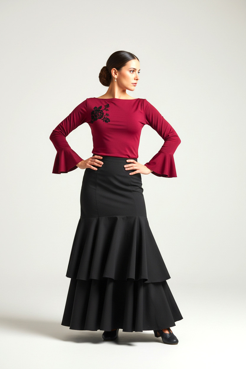 Top de manga hasta codos con aplicación de volantes en el bajo. Escote barca cerrado en delantero y más escotado en la espalda. Aplicación de vinilo en forma de flor en la parte superior derecha en color contraste.