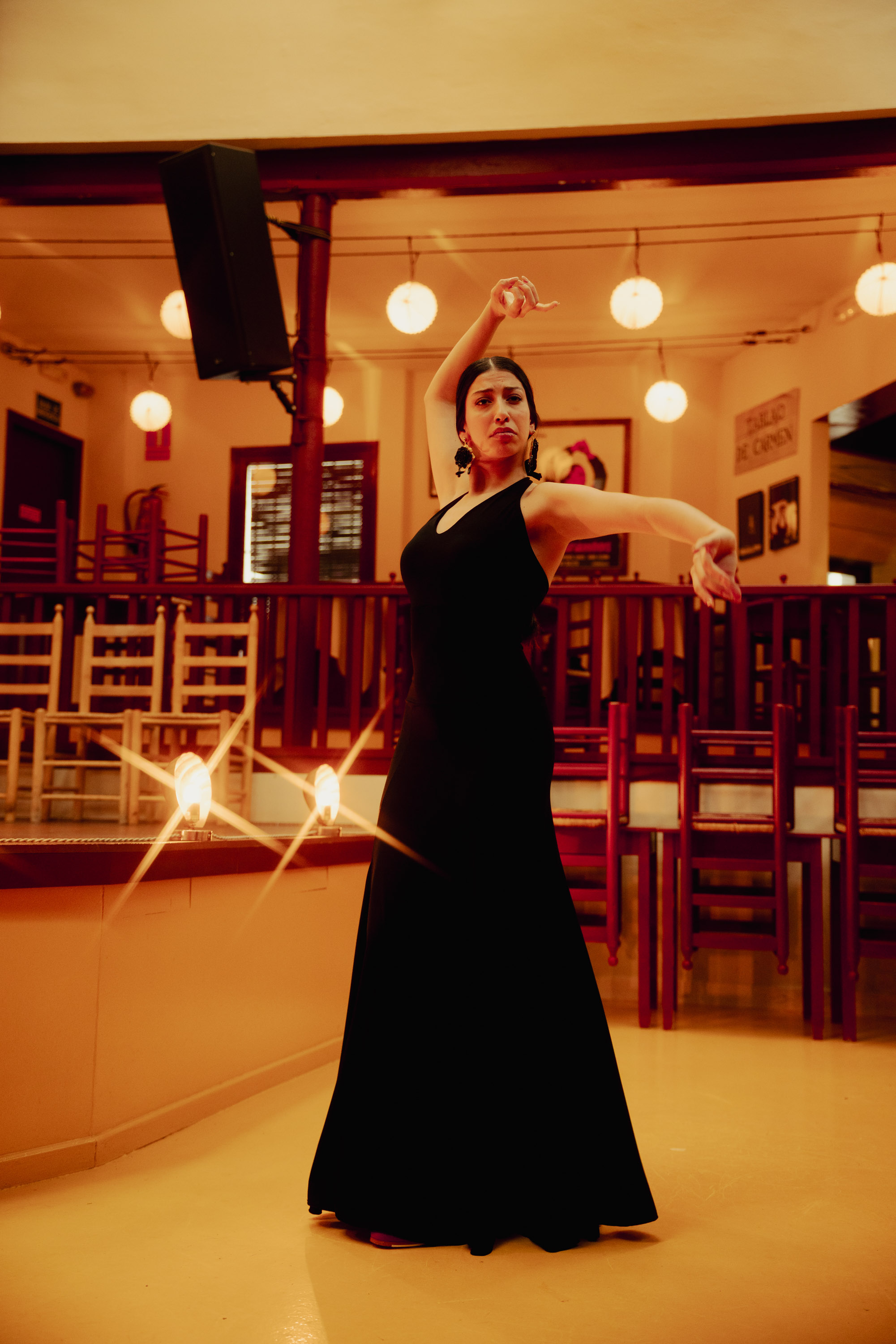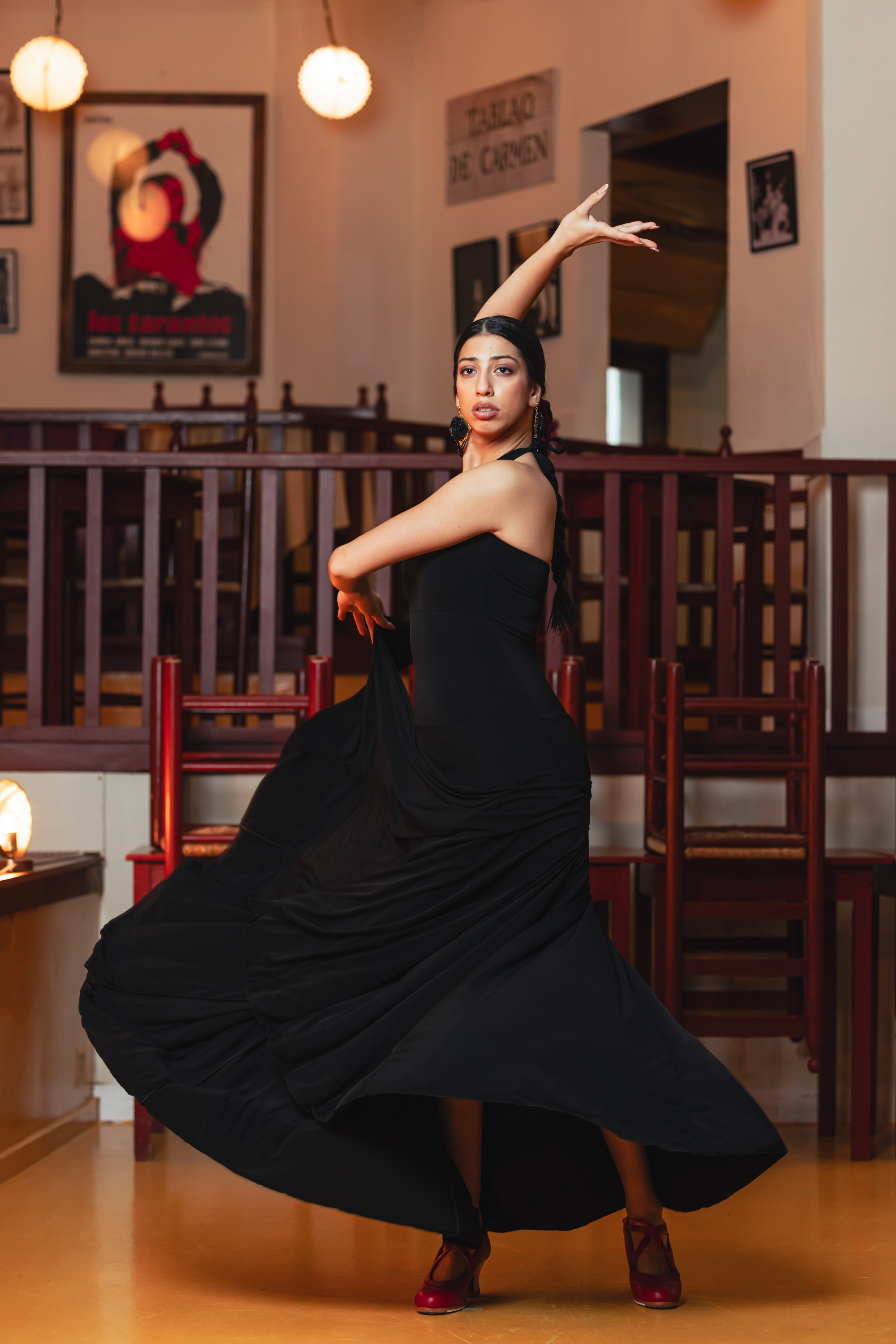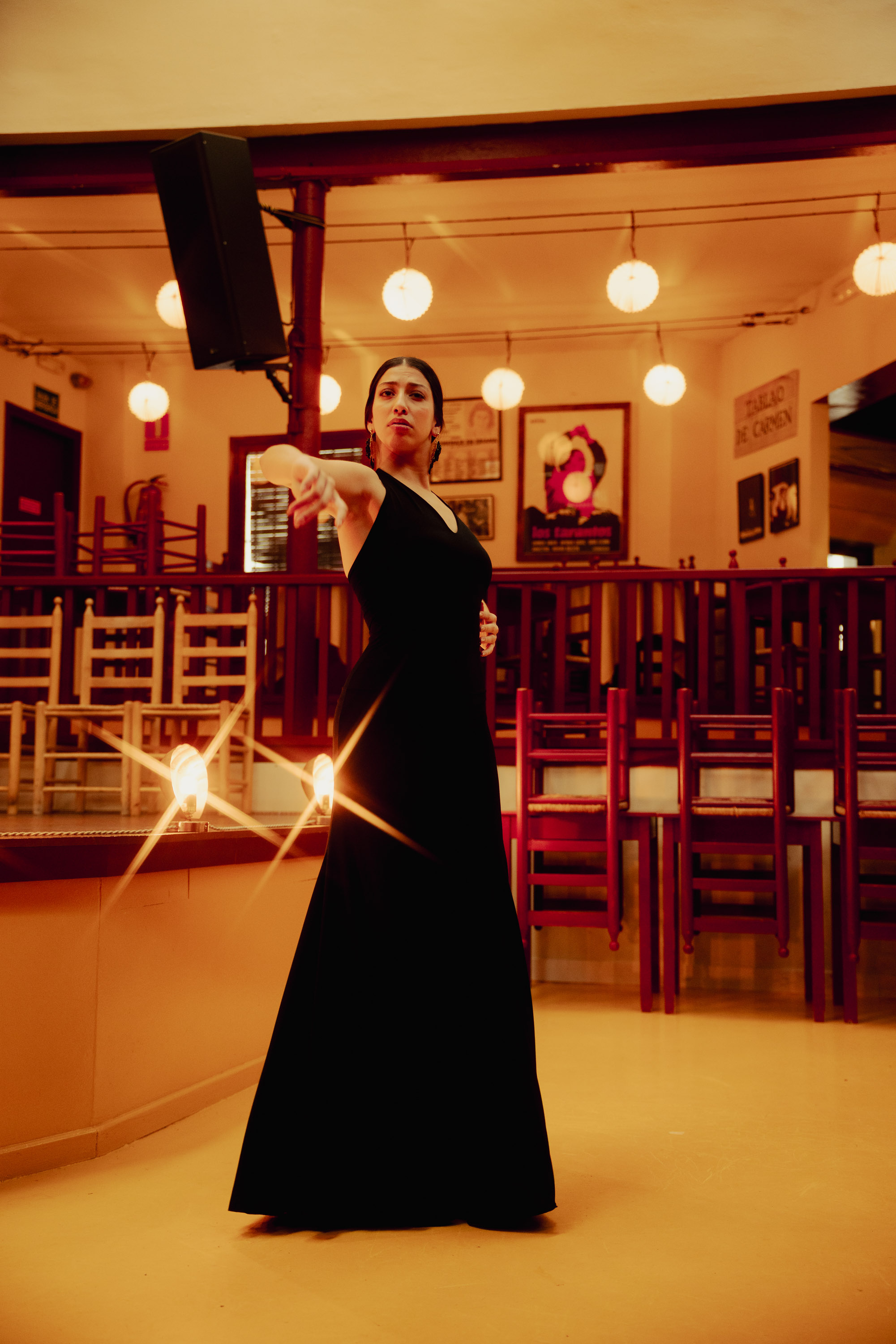 Vestido-Falda anudado al cuello. Falda-vestido de punto elástico negro, con fajín y anudado en el cuello. Delantero superior doble. Se puede colocar a modo de vestido, o anudar la parte superior en la cintura. Falda con 6 godets.